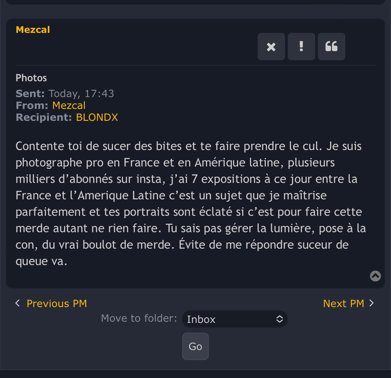 Bon comme il faut éviter de répondre aux c…, je me contenterais de partager les propos de cette soit disant superstar de la photo qui use de termes inappropriés pour donner des conseils éclairés ou son avis …