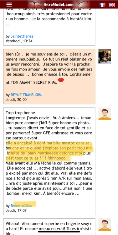 Petite question les gars svp, vous qui la connaissez; c'est bien sa bite posée sur le clavier de l'ordi dans le lien de Sunshine991?blackshemalelover a écrit :Effectivement, elle aime vraiment le sexe et se faire defoncer.. Elle est souvent au boisSunshine991 a écrit :Personnellement ma préférée reste https://www.escortsexe.net/slide-Trans- ... 83679.html , jusqu'à présent il n'y a qu'elle qui a réussi à bien m'encaisser (et je ne suis pas TTBM, juste dans la moyenne donc je ne comprends pas). Quand je vois des escort comme Renata Davila qui font des vidéos avec des partenaires avec d'énormes calibres et que ça a du mal à m'encaisser je me dis que beaucoup d'escortes jouent sur ce côté "on aime les ttbm" (même s'il y en a vraiment) et survendent.