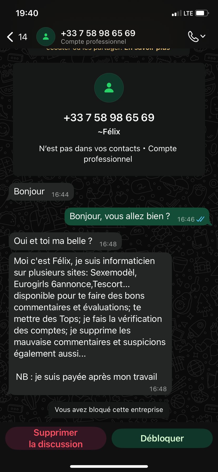 Coucou ma belleGomes a écrit : ↑22 nov. 2025, 19:42 Chaque jour que si passe c’est plus difficile de travailler ici en France à cause de faux profils et certes ‘agents’ qui propose de faux commentaires après les avoir déjà fait ! je recevoir au moins 3 ou 4 messages de numéros différents par semaine à offrir cette genre de service que pour moi n’intéresse pas mais je voudrais vous dire que si un jour vous voyez cette genre de commentaire sur mon annonce cette pas moi qui lui commande ! Bonne soirée !![]()