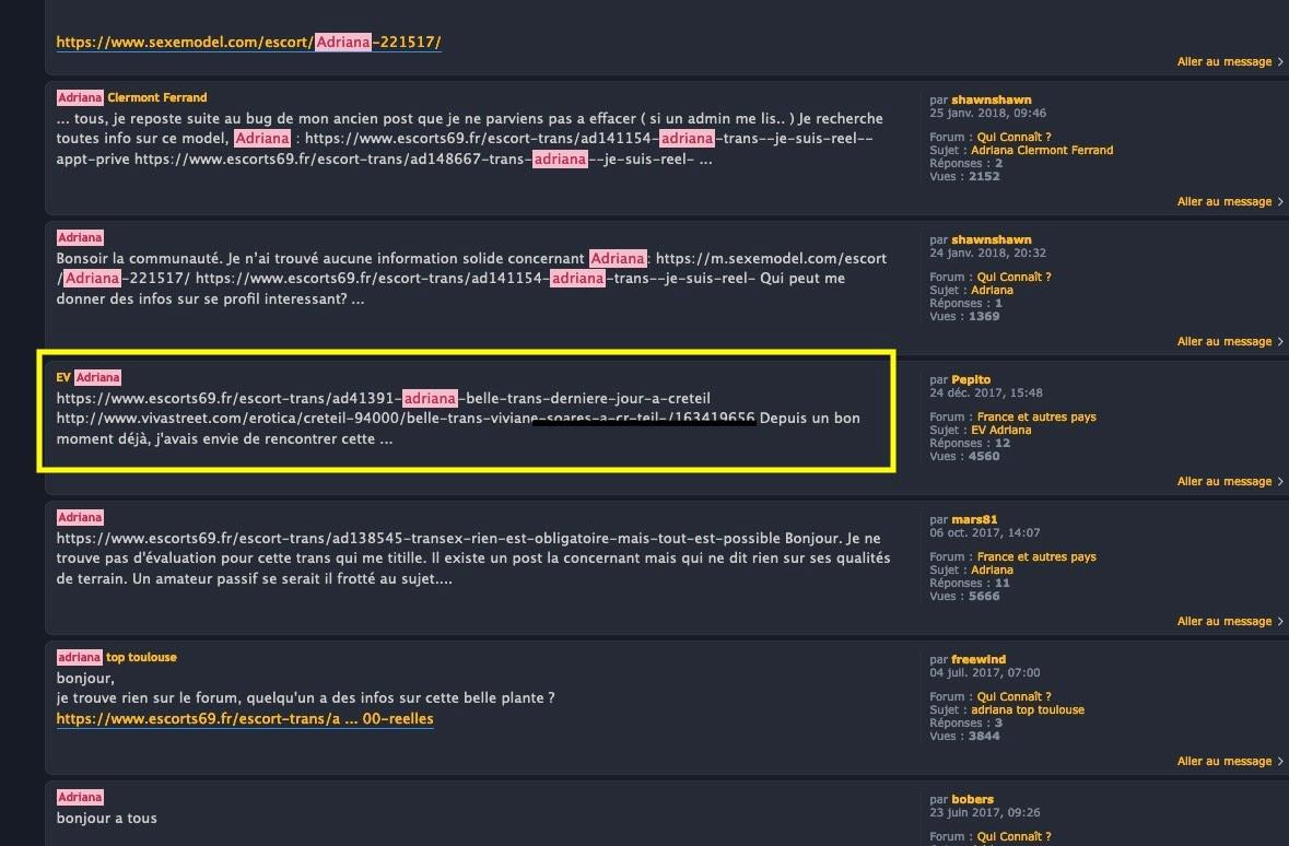 maxlamenace a écrit : 22 juin 2022, 14:31 par exemple, je cherchais le fil d'Adrianna :lol: pour poster et insérer des photos....j'ai tapé Adriana, Adrianna, Adriane, Adrianne...et rien! j'ai donc ouvert un nouveau sujet et plus tard en fouillant j'ai finalement trouvé...le fil s’appelait "EV Adrianna" mais le moteur de recherche ne l'avait pas détecté