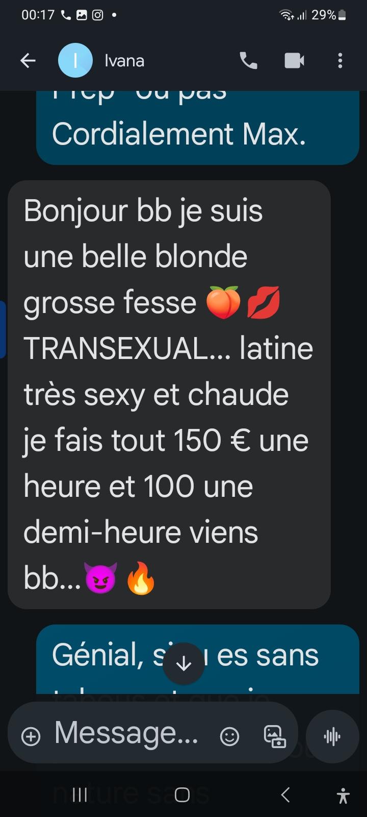 Max_Brun a écrit : ↑27 mai 2025, 21:04 Excellent choix, pas de tabous, après c'est à toi d'être sûr de ce que tu veux d'elle. Effectivement elle avale ta bite comme une glace qui fond au soleil, pipe gorge très profonde ( la mienne 17 mais je sais qu'elle peut gober un bras de bébé de 8 mois même si ses yeux rouges pleuront ) , elle est très efficace pour les actifs, certainement un peu moins pour les passifs ( sauf si accessoires ) car sexe assez petit, mais son cul est un nectar de douceur à baiser... Ceci dit Ivana n'est pas une escorte de standing, j'ai tout de suite vu qu'elle a très bien connu la rue, les bois..et servi des clients peu émotifs et à la chaîne avant de se lancer dans le Airbnb, mais à côté de çà, cette jolie péruvienne reste ultra professionnelle concernant le résultat de ses prestations en appartement, .. elle n'a pas subi énormément de chirurgie, les seins n'ont pas d'implants ( son prochain projet ), et son visage est presque original ( je l'adore ! ) , les prises d'hormones à elles seules font merveilles sur elle, elle est sous Prep pour information supplémentaire, ... Point négatif sur le long terme : forte probabilité qu'elle se tire des rails de temps en temps pour garder la forme, ... ses photos sont très réalistes de la réalité, elle bosse dure c'est sûr ! et beaucoup ! mais elle n'est absolument pas défraîchie.